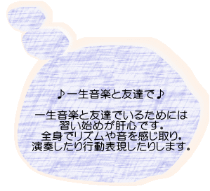 ・・・とはいっても子どもたちにとってはあくまでも“♪楽しい音楽遊び♪”音楽の楽しさを身体いっぱいで味わいながら子どもたちの持っているあらゆる能力を引き出すための教育なのです。これから受けるであろうあらゆる教育を充分に吸収し、それらを足がかりに大きく育つための基礎造りのお手伝いをさせて頂きます。
