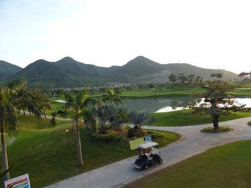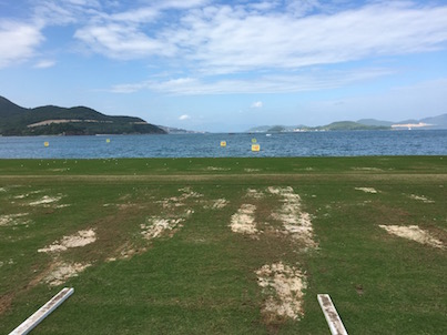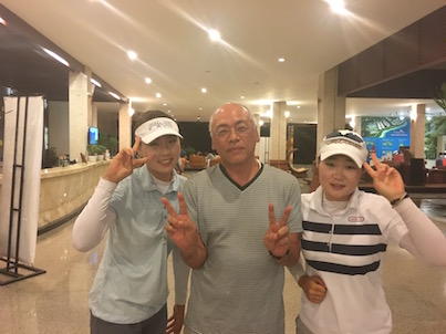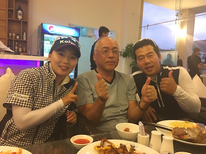 ラウンド後は、海に向かって球を打つなんとまぁ野趣あふれるドライビングレンジで、ナリプロと李コーチから特訓を受ける。
