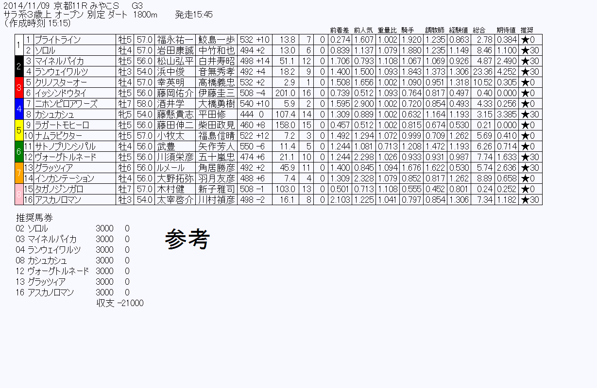 みやこステークス | サラ系3歳上オープン別定 | 1800ダート | 15:45 | 予想なし | 0 | 0 | 0 |