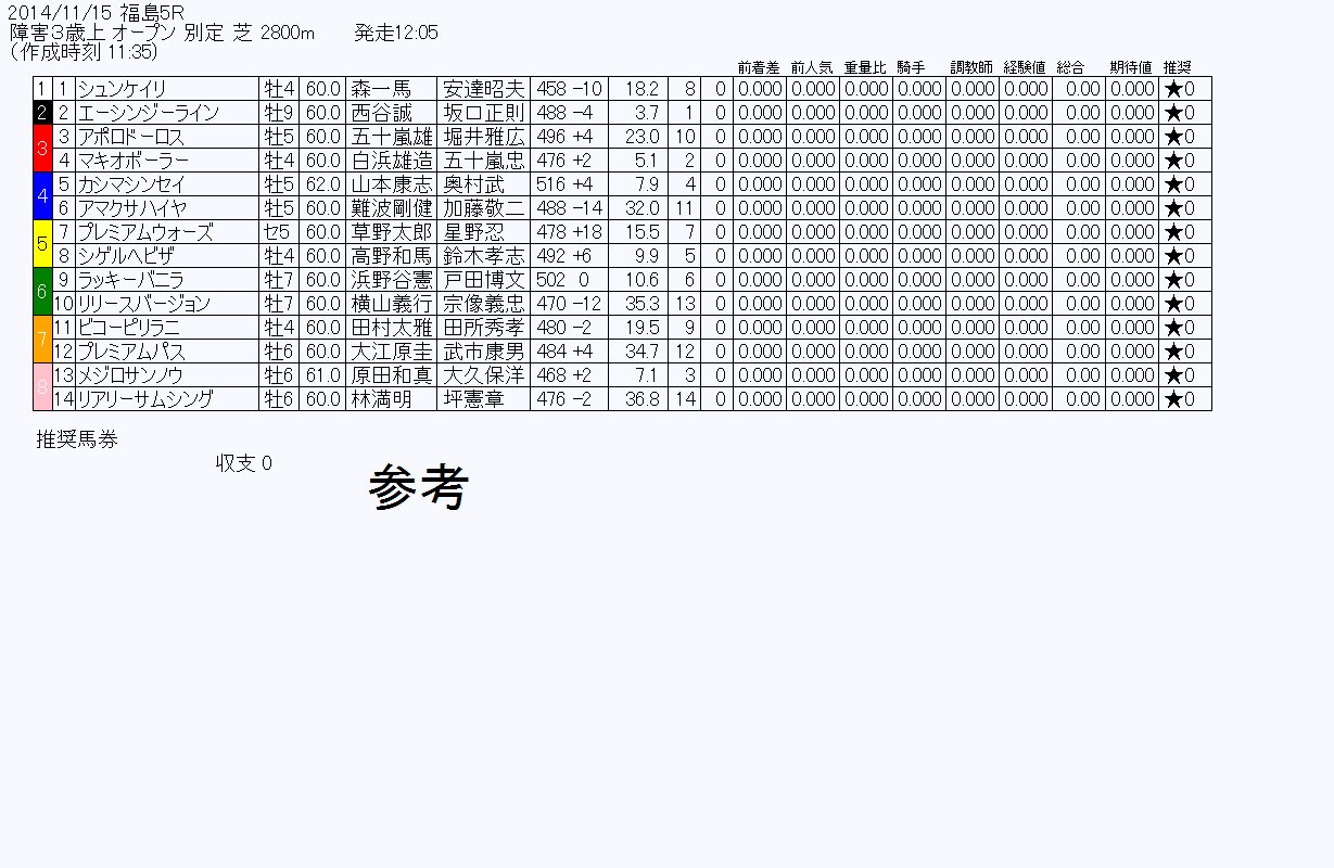 障害3歳上未勝利 | 障害3歳上未勝利定量 | 2800芝 | 11:15 | 予想なし | 0 | 0 | 0 |