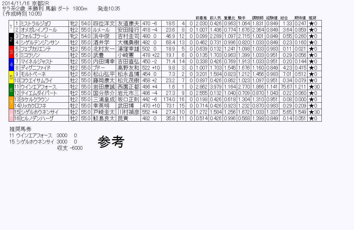 サラ系2歳未勝利 | サラ系2歳未勝利馬齢 | 1400ダート | 10:05 | 投票済 | 1300 | 0 | -1300 |
