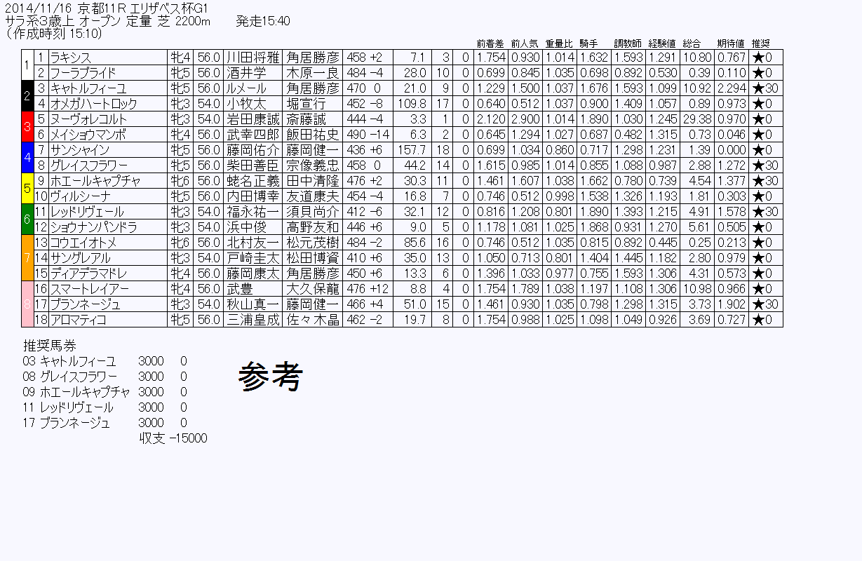 エリザベス女王杯 | サラ系3歳上オープン定量 | 2200芝 | 15:40 | 予想なし | 0 | 0 | 0 |