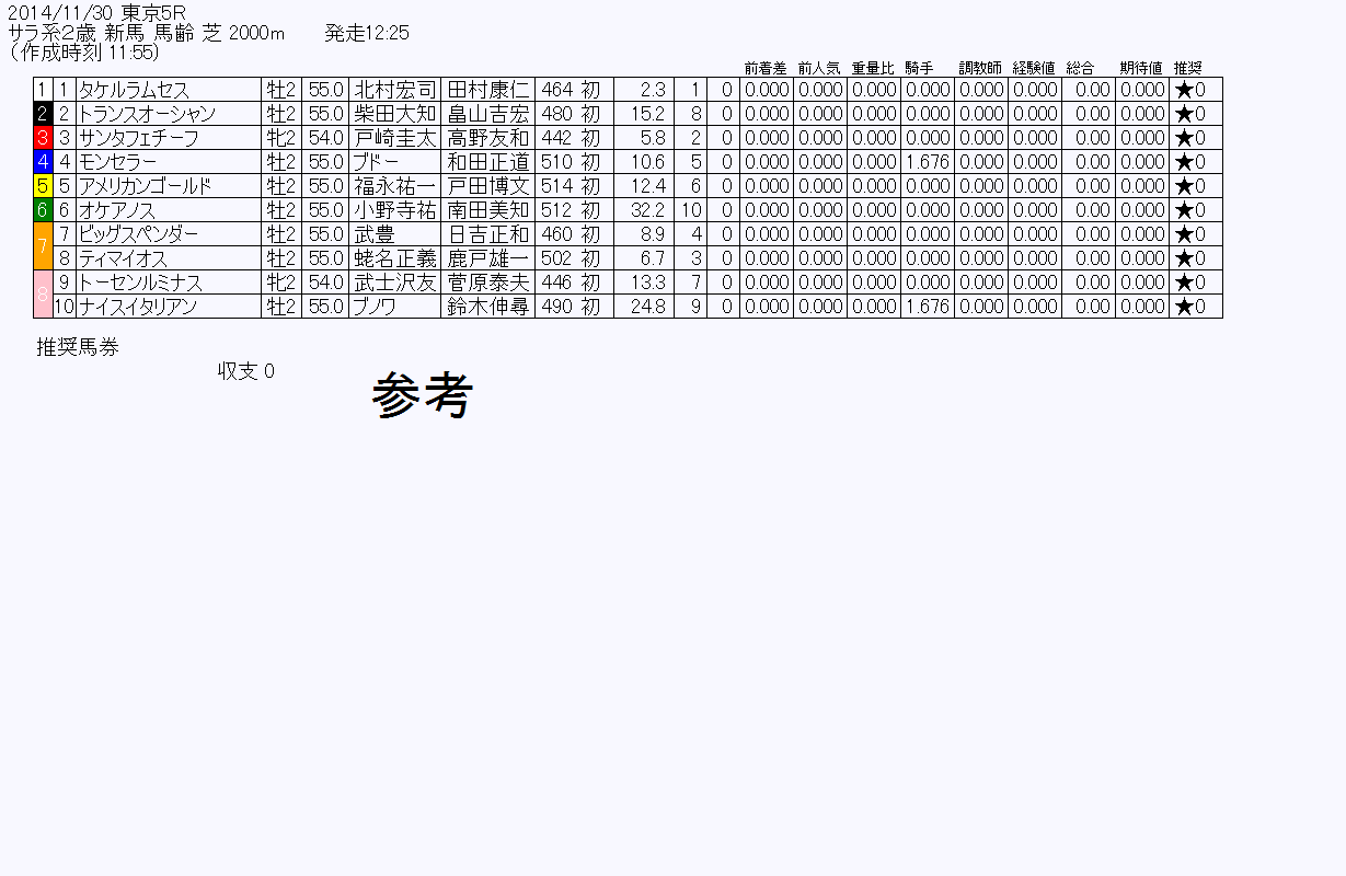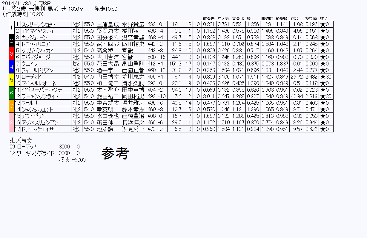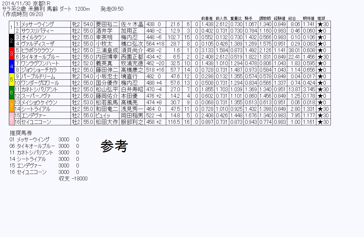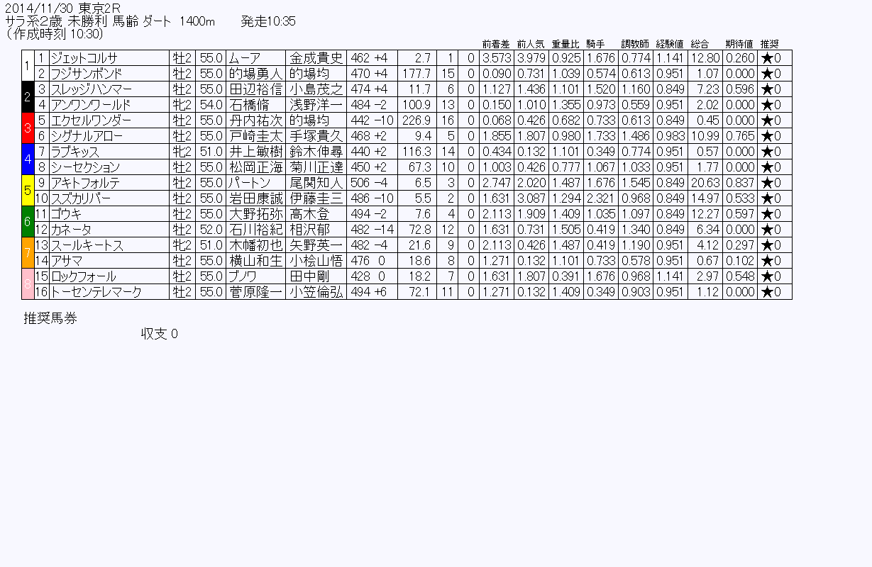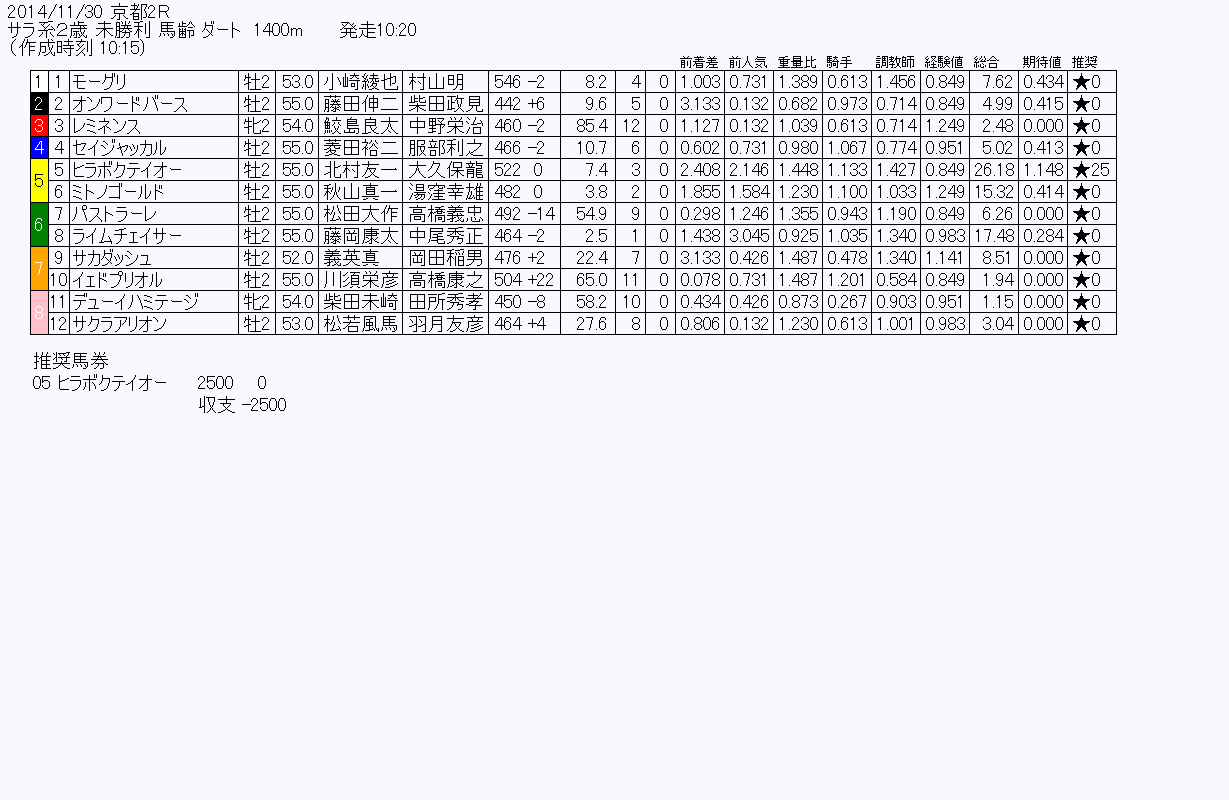 サラ系2歳未勝利 | サラ系2歳未勝利馬齢 | 1400ダート | 10:20 | 投票済 | 2500 | 0 | -2500 |