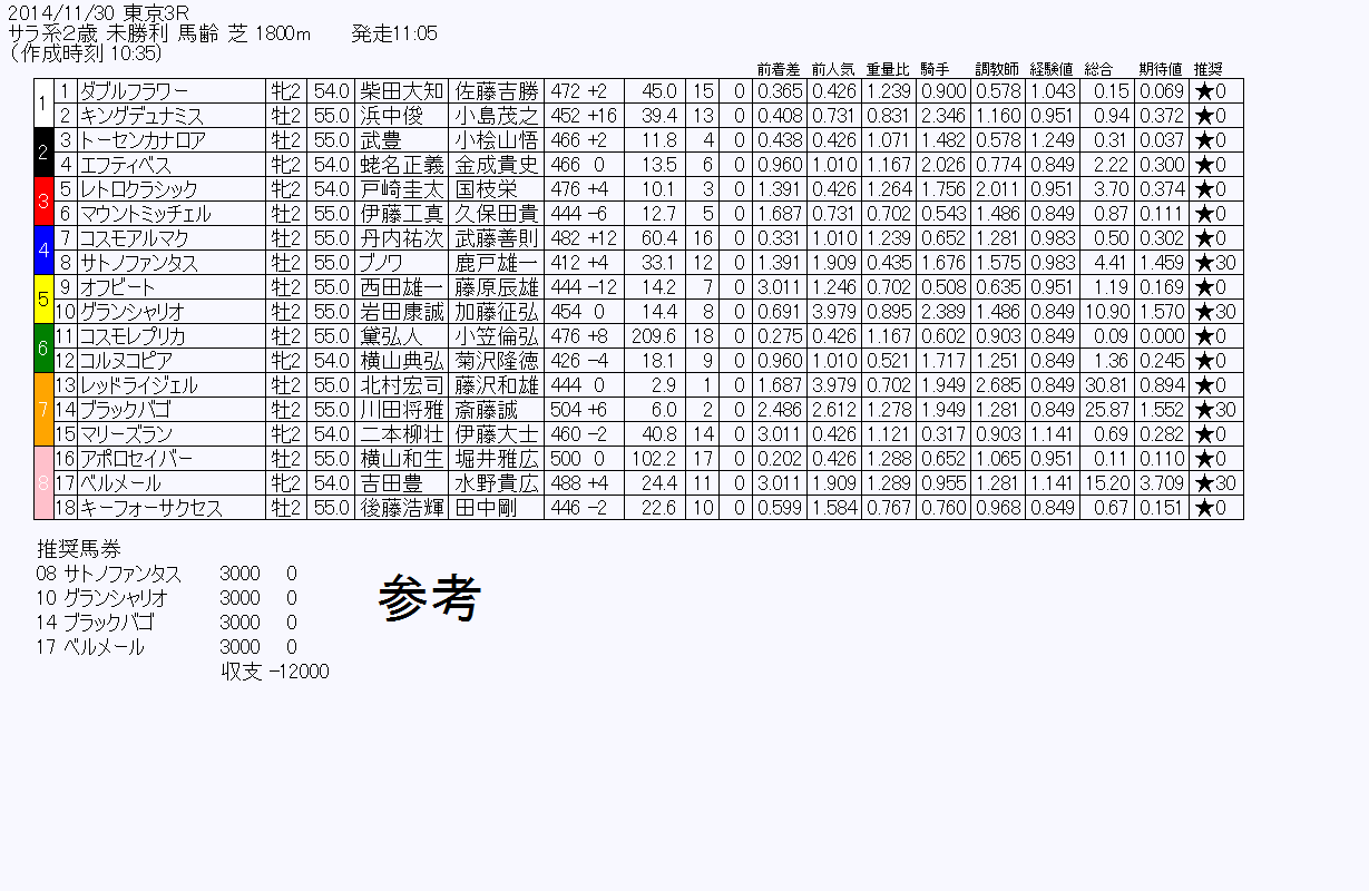 サラ系2歳未勝利 | サラ系2歳未勝利馬齢 | 1400ダート | 10:35 | 見送り | 0 | 0 | 0 |