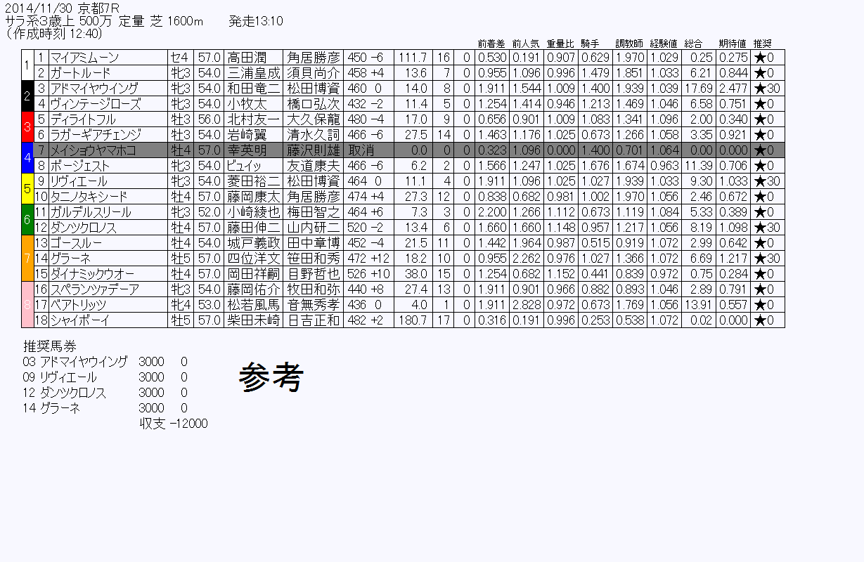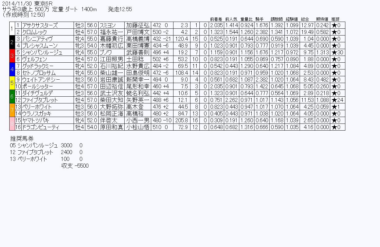 サラ系3歳上500万 | サラ系3歳上500万定量 | 1400ダート | 12:55 | 投票済 | 5500 | 0 | -5500 |