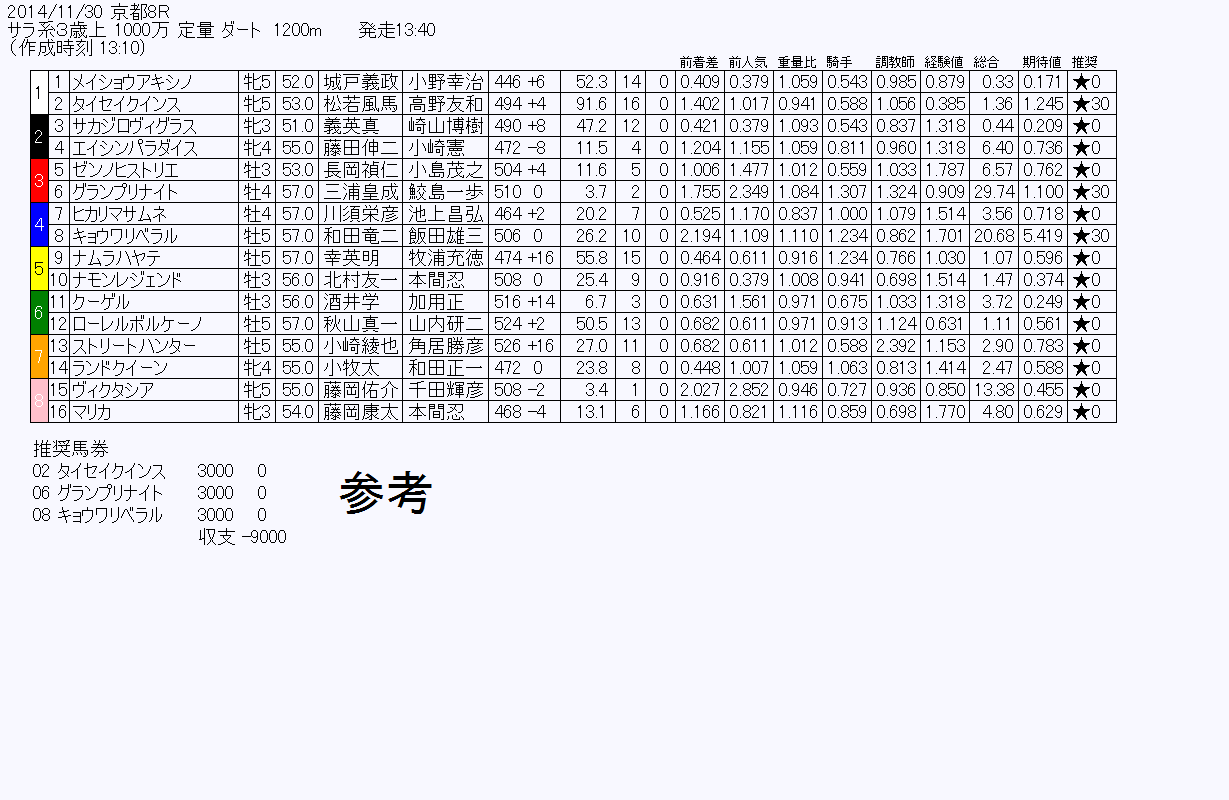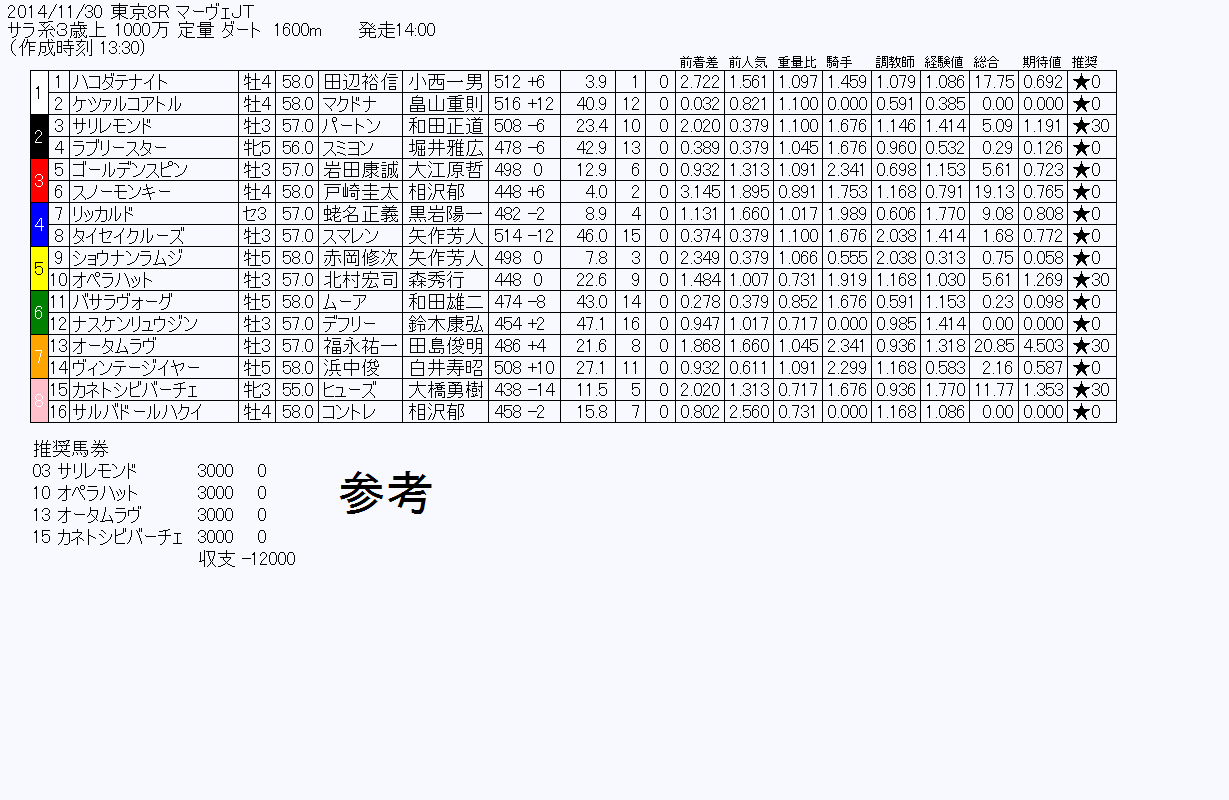 マーヴェラスJT | サラ系3歳上1000万定量 | 1600ダート | 14:00 | 予想なし | 0 | 0 | 0 |