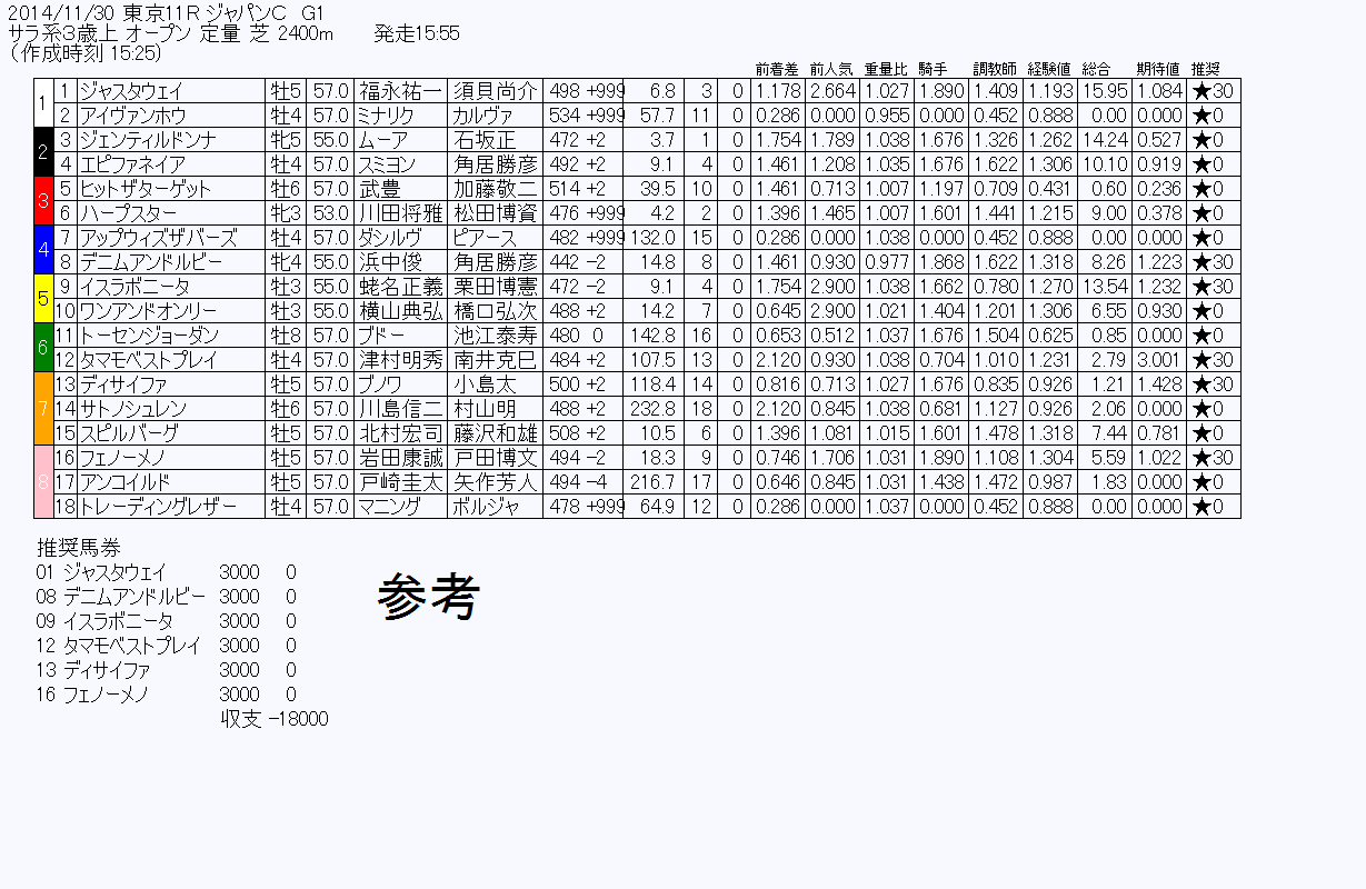 ジャパンカップ | サラ系3歳上オープン定量 | 2400芝 | 15:55 | 予想なし | 0 | 0 | 0 |