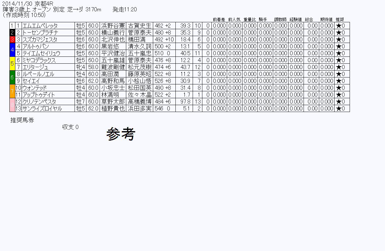 障害3歳上オープン | 障害3歳上オープン別定 | 3170芝→ダ | 11:20 | 予想なし | 0 | 0 | 0 |
