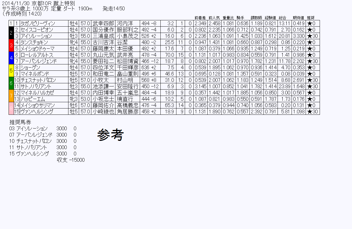 蹴上特別 | サラ系3歳上1000万定量 | 1900ダート | 14:50 | 予想なし | 0 | 0 | 0 |