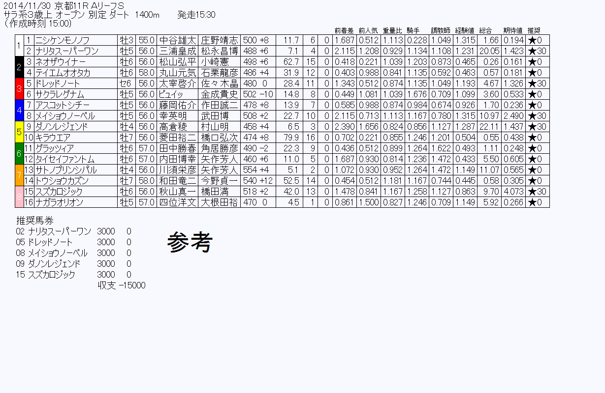 オータムリーフS | サラ系3歳上オープン別定 | 1400ダート | 15:30 | 予想なし | 0 | 0 | 0 |