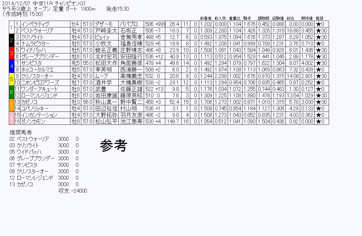 チャンピオンズカップ | サラ系3歳上オープン定量 | 1800ダート | 15:30 | 予想なし | 0 | 0 | 0 |
