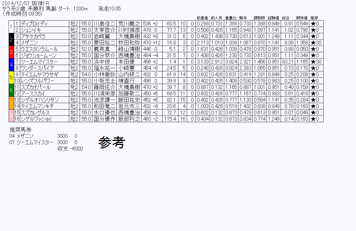 サラ系2歳未勝利 | サラ系2歳未勝利馬齢 | 1200ダート | 09:50 | 投票済 | 2900 | 0 | -2900 |