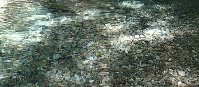 静かに流れる水面に川底の砂利が写り込み清清しい雰囲気。浅く見えたが腰くらいまでの深さがある。