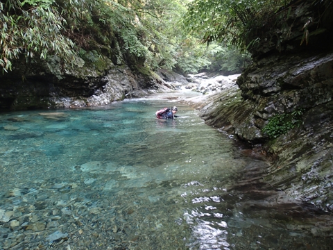 赤鍋滝に続くすぐ上流にあるエメラルド色の深い淵。