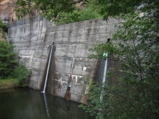 その右に曲がった先に古い堰堤が突然立ちはだかる。