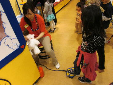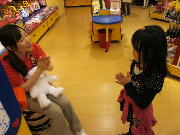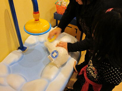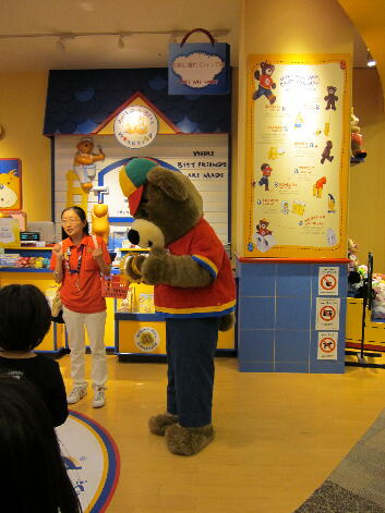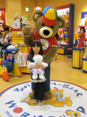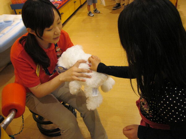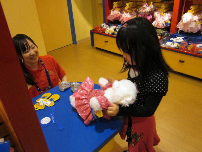 綿を入れる前のぬいぐるみに自分の好みの硬さに綿を入れ、ハートもいれるお店へ。