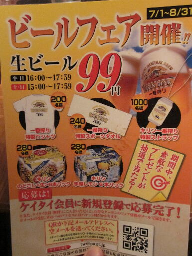 なんと2時間以内ならビールは99円にひかれて入りました。