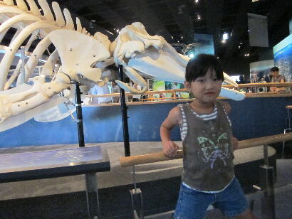 左:水で紙を切る?! 切れました! 右:クジラの骨格標本。大きいです!