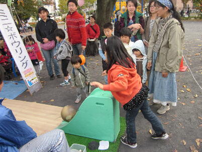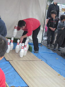 地元久米川ボウルさんも出店。本物のレーンで使っている板とボウル、ピンで出前ボウリング。