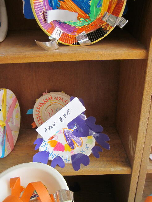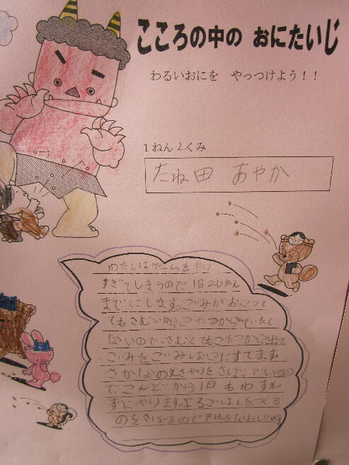 学校での作品展示。悪い鬼をやっつけるとのことですが・・・