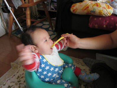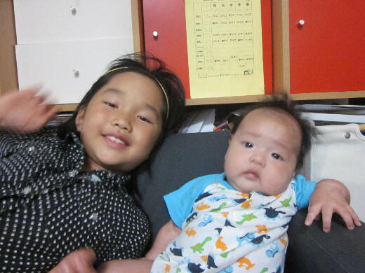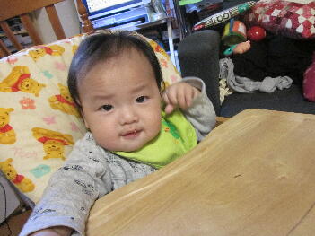 テーブル付きの椅子初体験。 まだちょっとおおきいです。