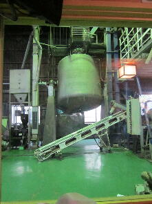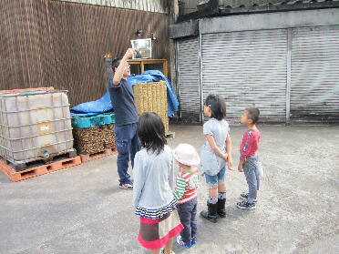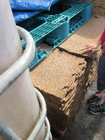 係りの人の説明を聞きます。右は醤油を絞った後のかす。牧場で牛の餌になるそうです。