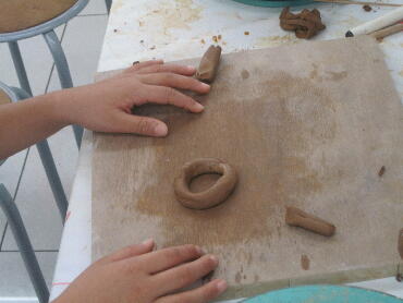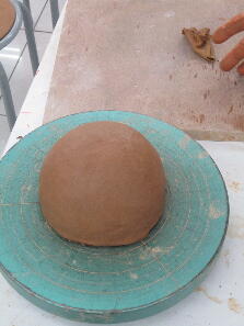 円形に切った土をボールの型に押し当てます。結構難しいです。